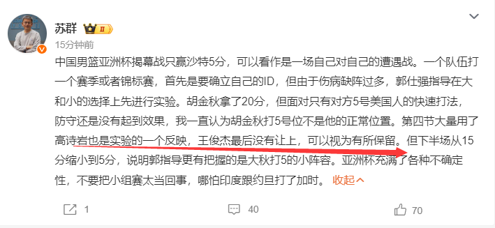苏群老师对王俊杰只打15分30秒的解读是——郭士强指导有所保留,第四节大量用高诗岩是在实验。