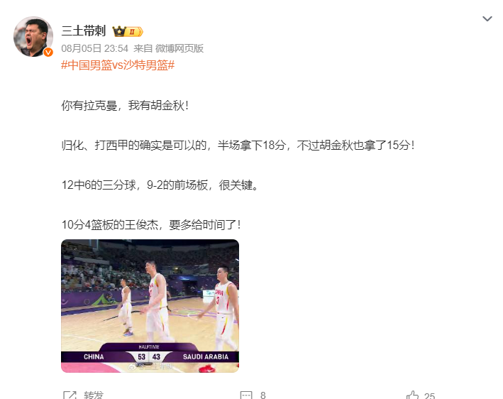 北京时间8月5日,2025年男篮亚洲杯小组赛,中国队以93-88击败沙特队。这场比赛20岁的小将王俊杰给球迷们留下了深刻的印象,随后他只打了15分30秒可还是上双了,很多媒体人都觉得他应该获得更多四号位上的轮换时间。